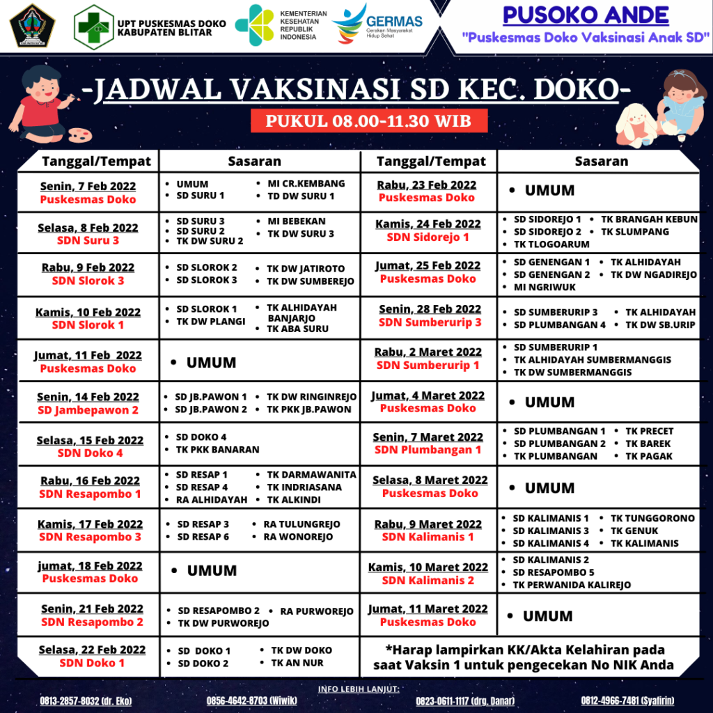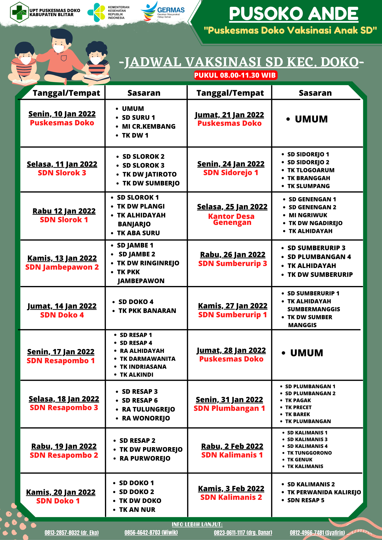 Mulai bulan ini kegiatan vaksinasi akan dilakukan di Puskesmas Doko. Silahkan untuk datang langsung ke lokasi membawa kartu vaksin serta KTP ya D’Peoples!